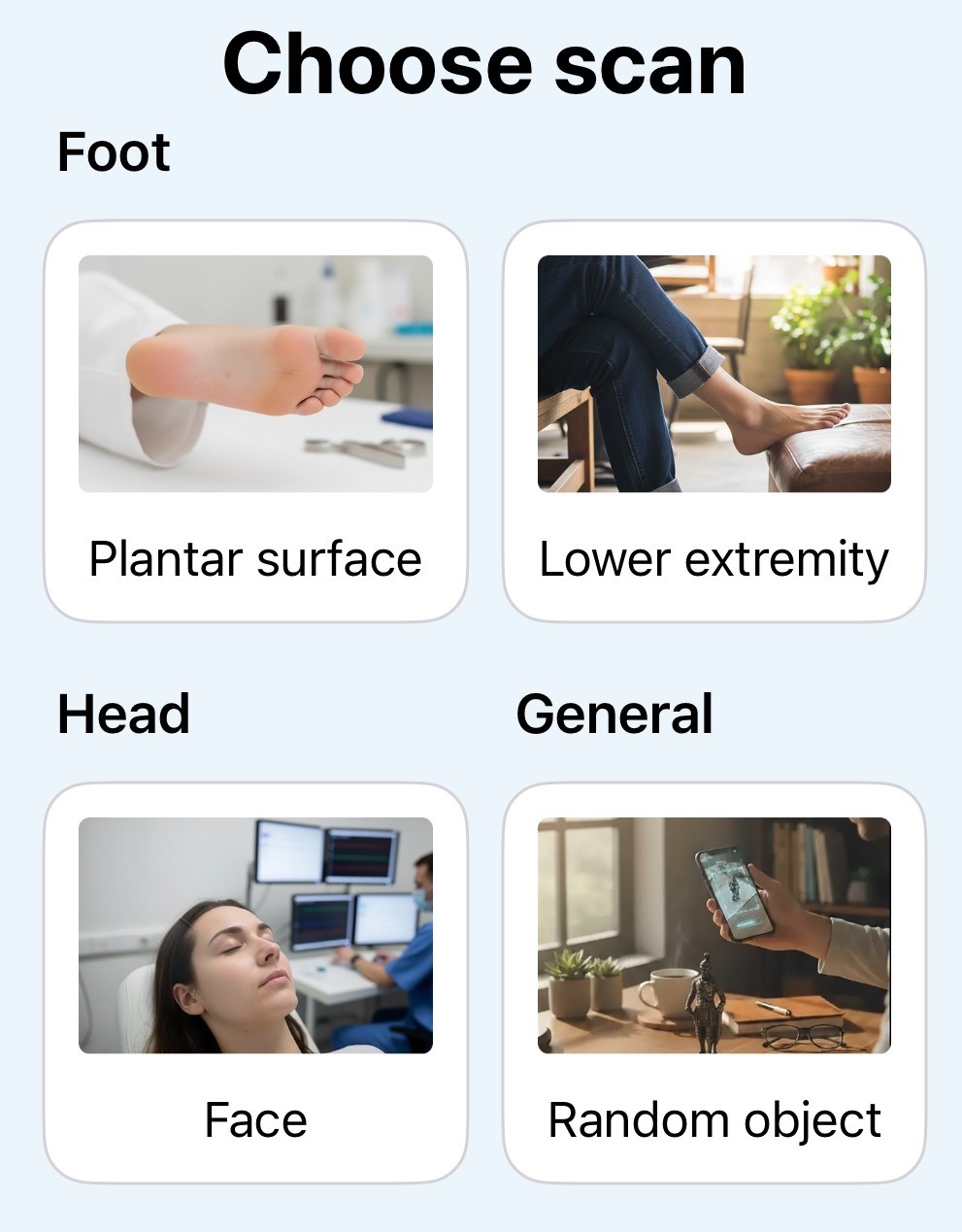 The best mode for scanning feet. Smallest scan size: plantar surface Ideal scan size: Whole foot Largest scan size: Foot + Ankle |