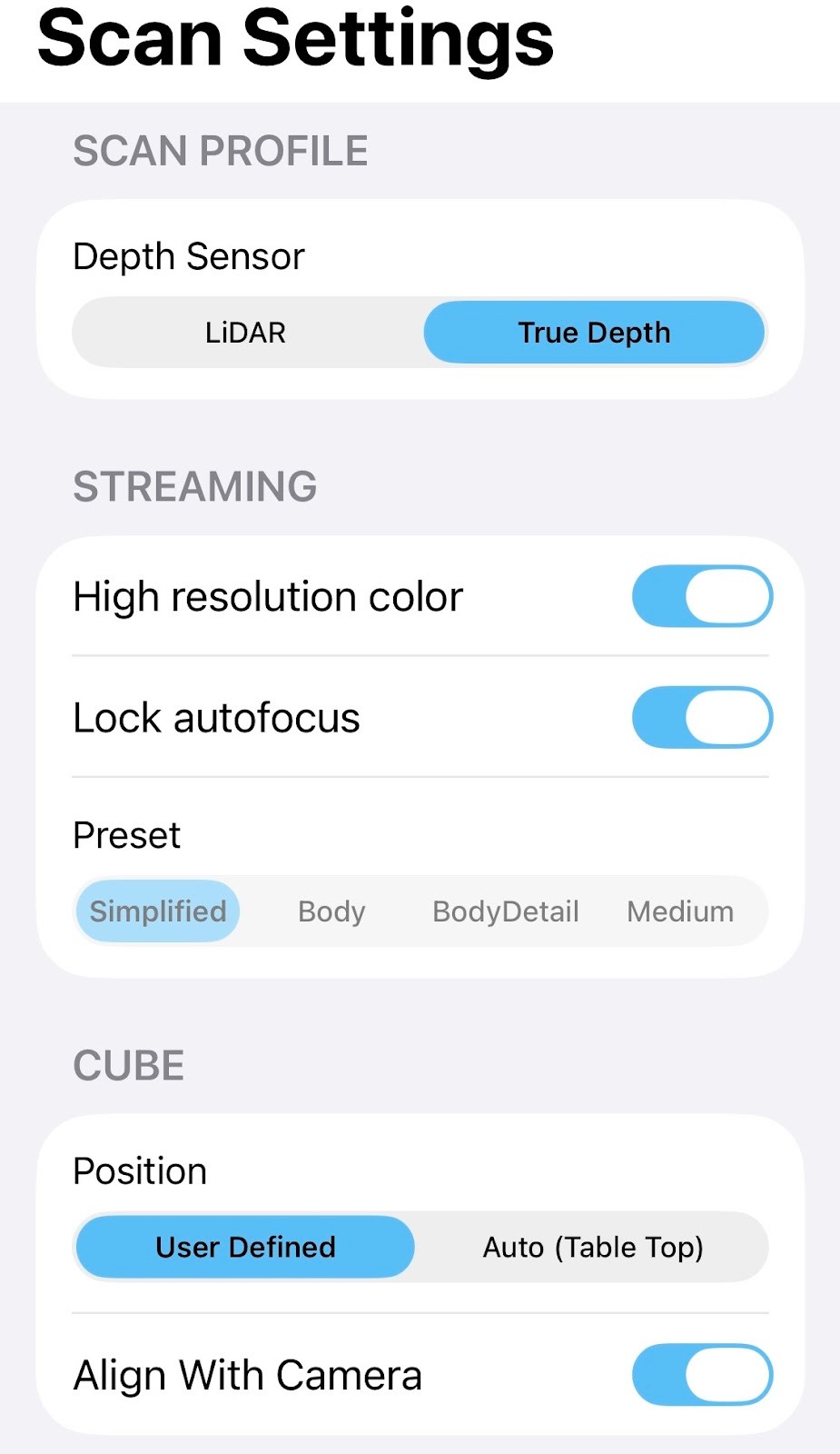 | Depth Sensor | This determines whether scanning is done using a Structure Sensor, the iPad/iPhone's TruDepth camera, or LiDAR. The last two sensors are available on all iPad Pro 11-inch (2nd generation or later) and iPad Pro 12.9-inch (4th generation or later) |