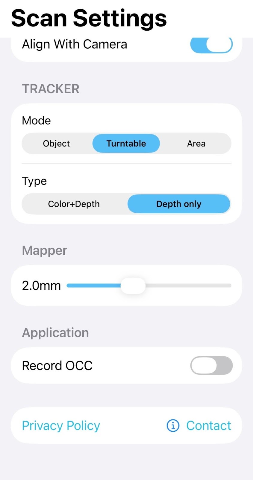 | Record OCC | Creates an OCC file instead of a mesh. | Leave off unless instructed to use by a structure support agent. OCC files are special diagnostic files that include mesh, depth maps, and IMU data, they are triple the size of normal files and can’t be used like normal scan files. |